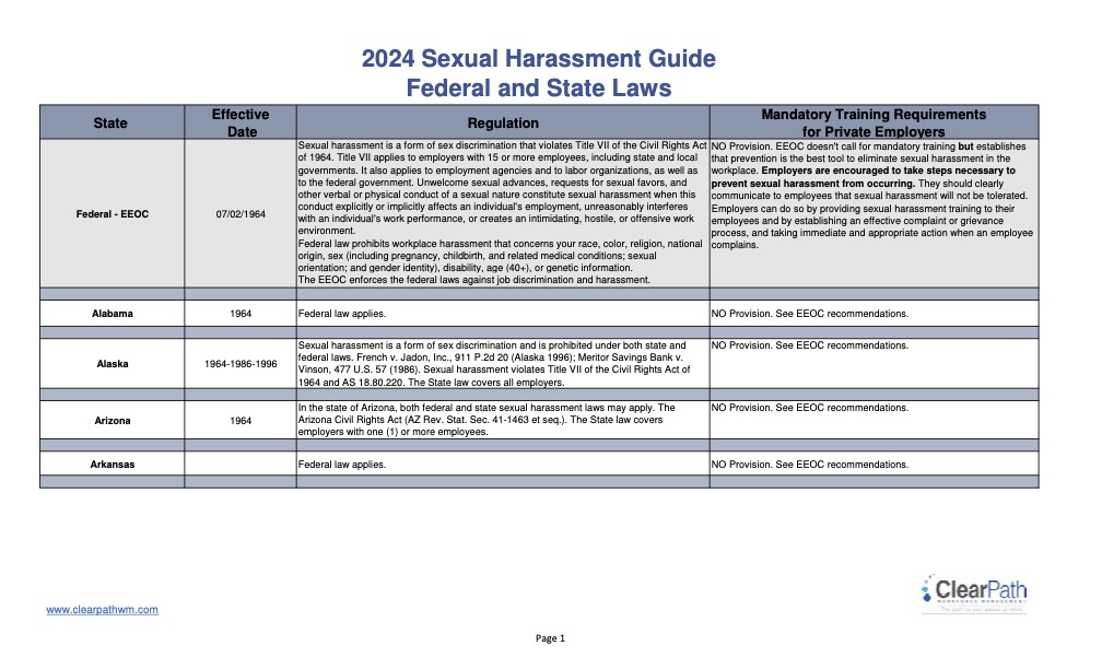 Sexual Harassment Training Mandates by State for 2024 Preventing sexual harassment has been on the agenda for most companies since Title VII of the Civil Rights Act of 1964, which prohibits sexual harassment and discrimination in the workplace. But